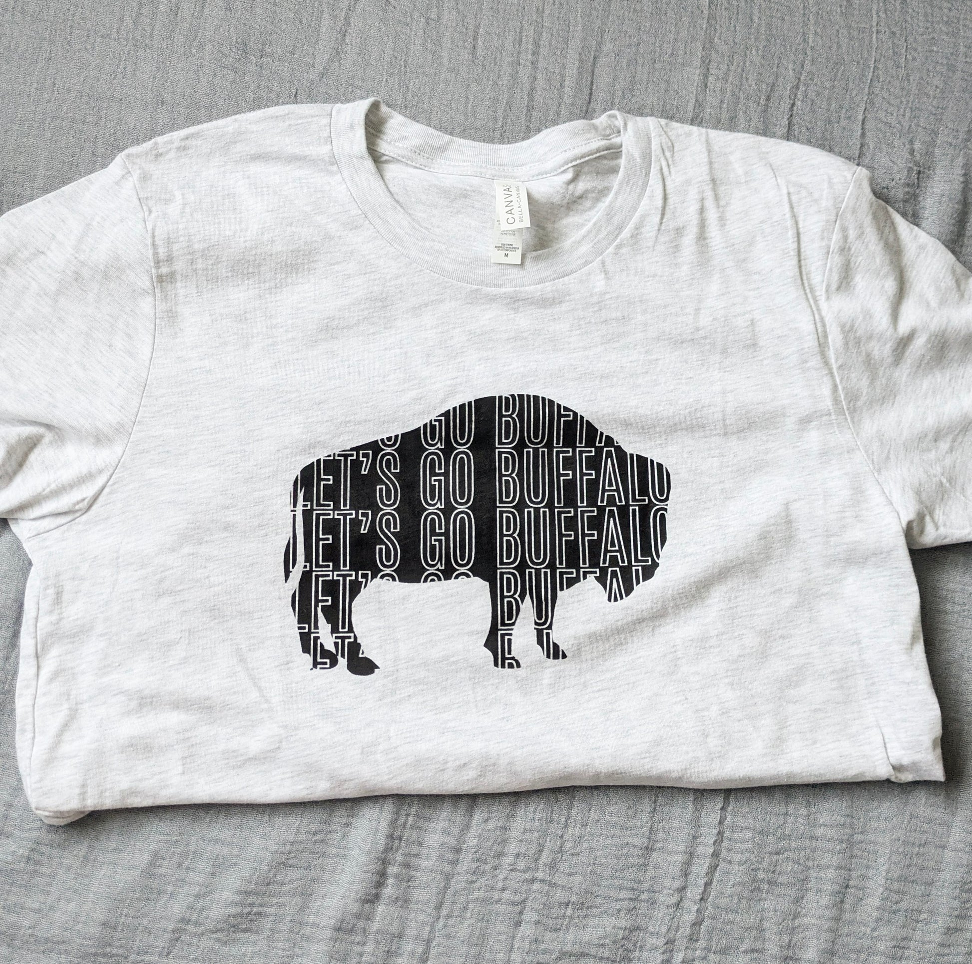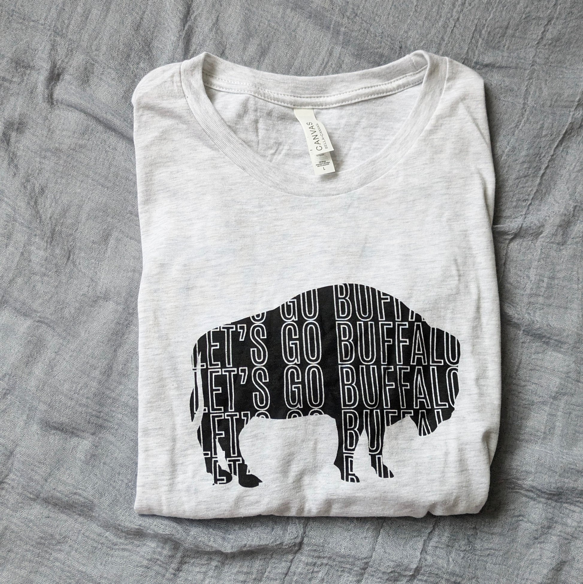 99% cotton 1% polyester, ash gray t shirt with black or red buffalo graphic.