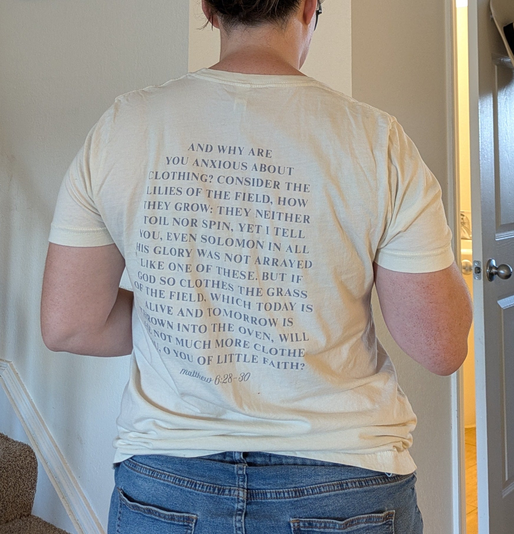 Cream colored tee, 100% cotton with lavender/gray ink. Front has "consider the lilies" with lilies of the valley, and the back has scripture from Matthew 6:28-30.