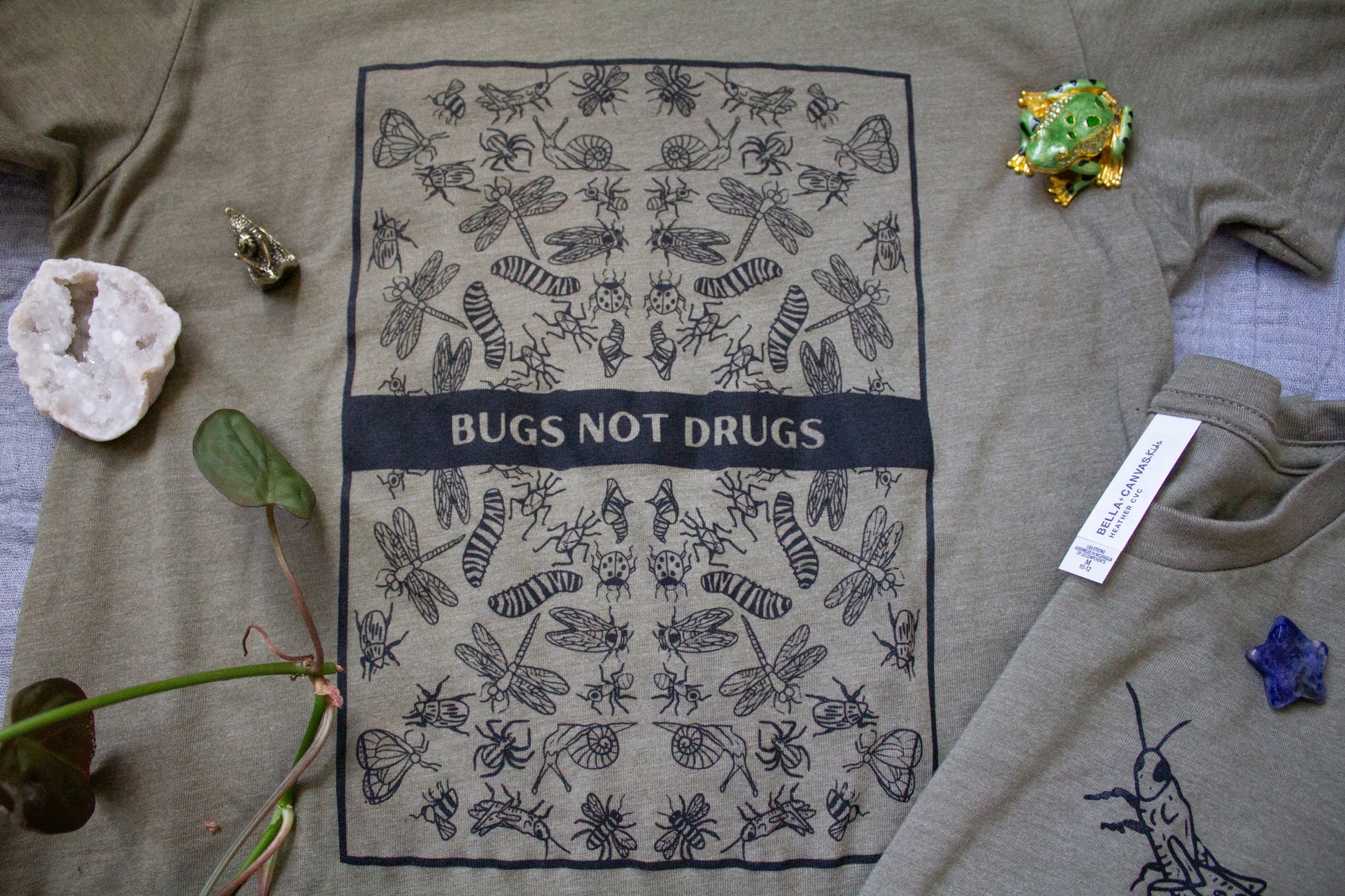 Olive green 100% cotton crew neck t-shirt. Front left chest image has a grasshopper, and the back has a "bugs not drugs" graphic.